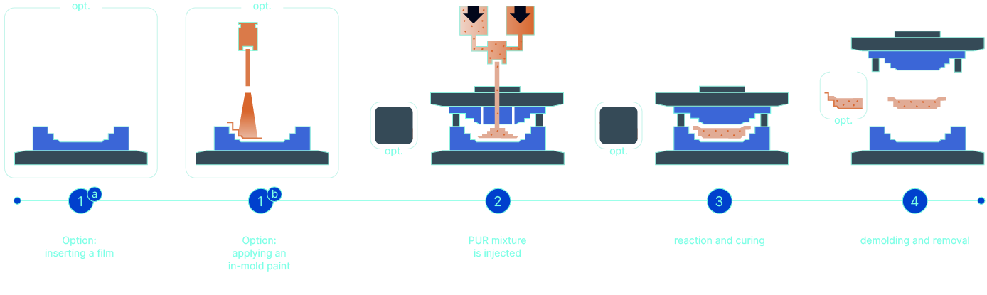 在多用途的 RIM 工艺中,多元醇与异氰酸酯通过对向流注射原理混合。发泡的反应混合物能够填充复杂的模具几何形状,即使是大型部件也不例外。